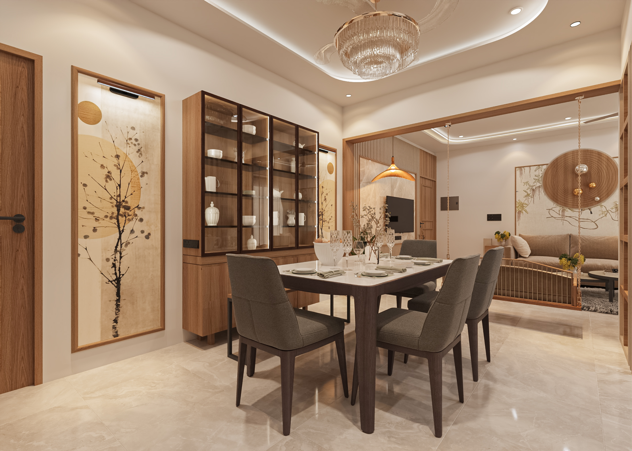 The living and dining areas were planned as connected yet distinct zones. Custom furniture, subtle textures, and a neutral color palette create a warm and elegant atmosphere. Layered lighting enhances architectural features while maintaining a calm and welcoming environment.