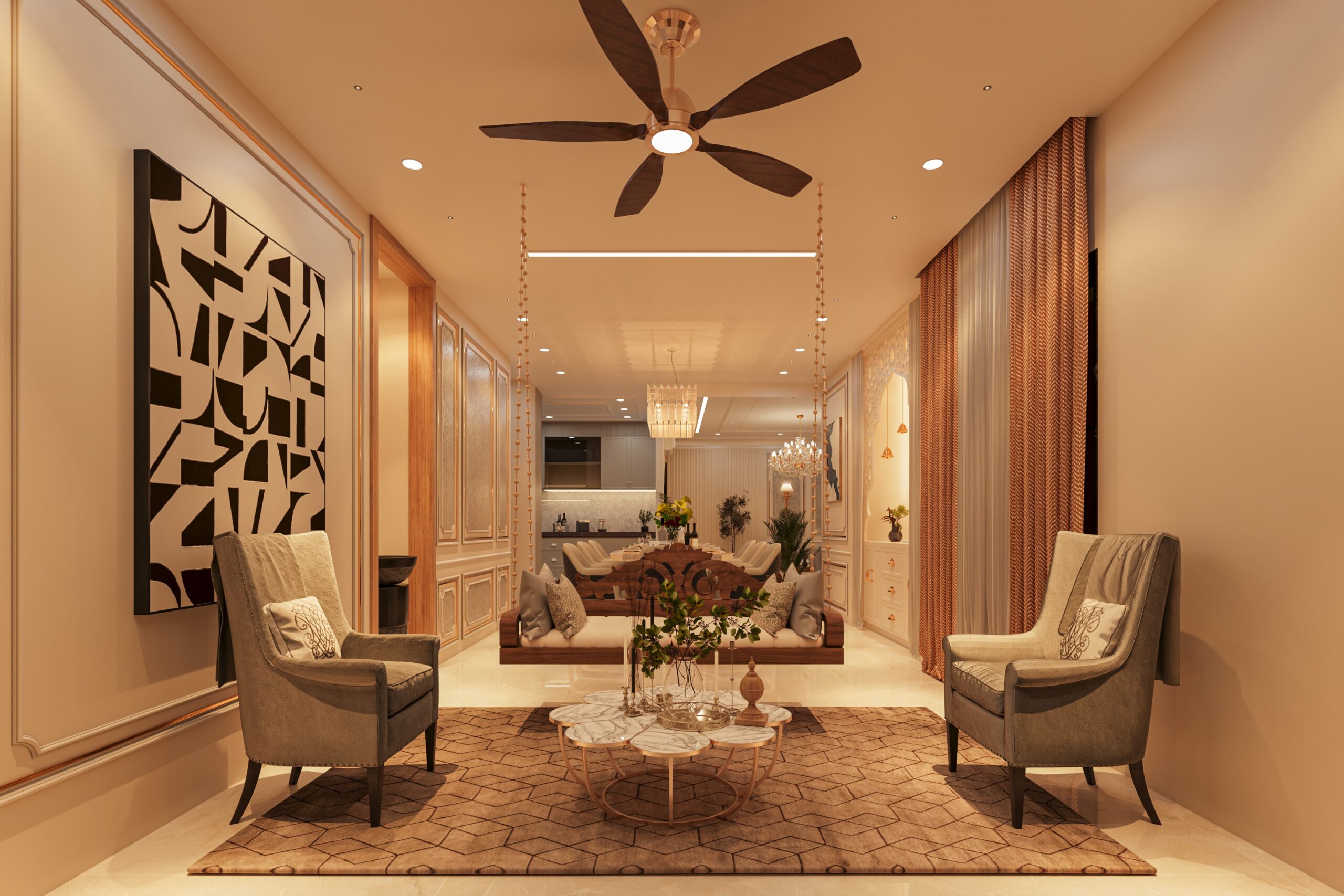 The Shreeji Apartment interior stands as a refined residential transformation by Vogue Dimension, delivering functional clarity, visual harmony, and timeless elegance suited to contemporary living.